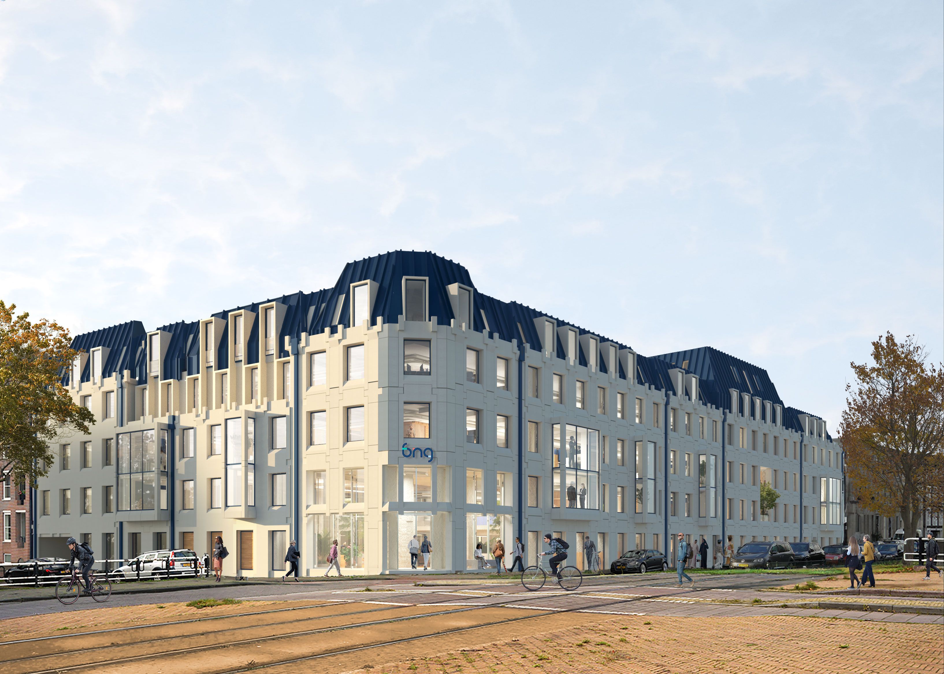 In the heart of The Hague, on the corner of Houtweg and Koninginnegracht, BNG's iconic office building is undergoing a thorough transformation. The existing building from 1980 will not be demolished, but carefully transformed into a contemporary, energy-efficient and healthy office. By doing so, BNG Bank not only opts for the preservation of value and cultural history, but also for a sustainable future. The renovated building meets the requirements of today and tomorrow: energy-neutral, nature-inclusive and with maximum attention to the welfare of the users.