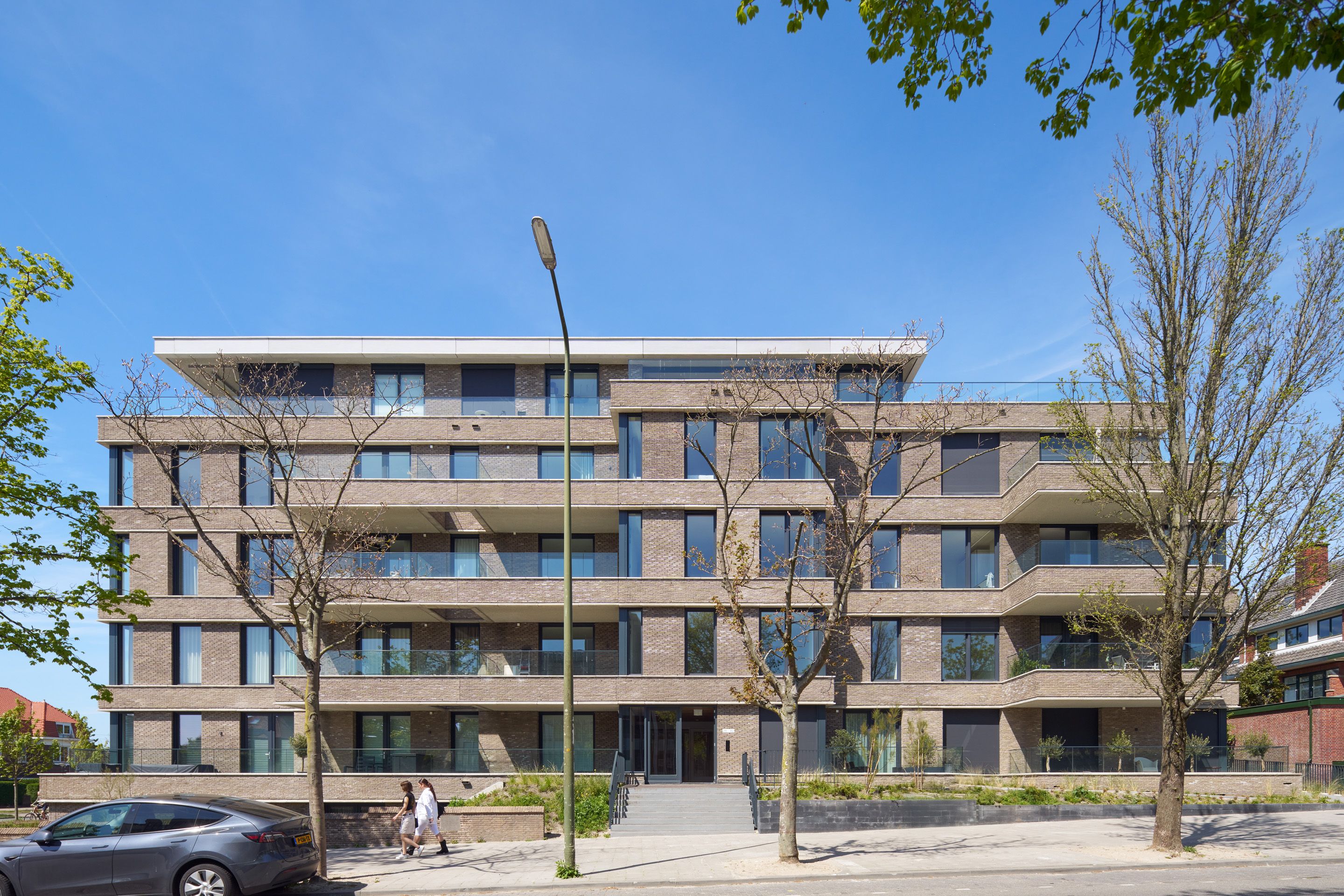 A residential project has been realised at the junction of Nieuwe Duinweg and Nieuwe Parklaan: 29 luxury flats in a building partly reused from the former office at Nieuwe Duinweg 24. Only the concrete shell is retained, while the facades, walls, balconies and roof are completely renewed. The design by Kraaijvanger Architects is inspired by historical architecture from the early 20th century, with soft grey brick, horizontal concrete bands and generous outdoor spaces per flat. Each flat have garden terrace, balcony or roof terrace and a lush, dune-like garden all around. Also sustainable: energy label A+, no gas, ground heat for underfloor heating and cooling.