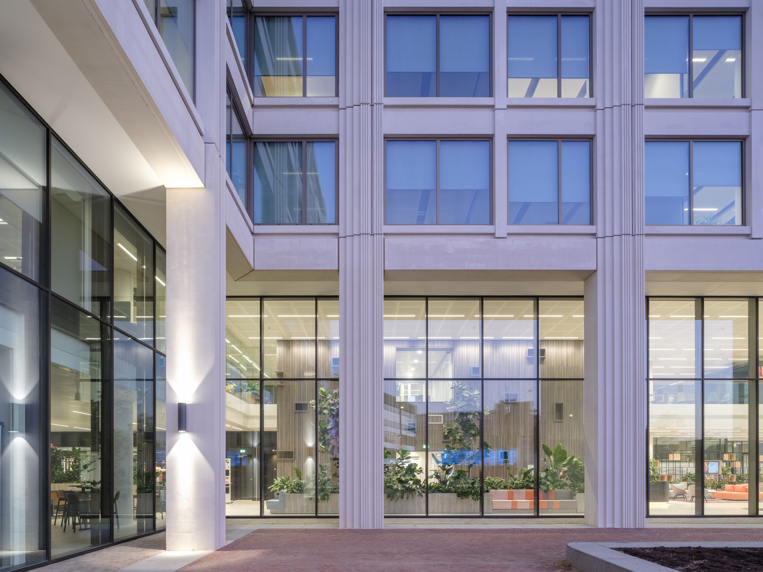Twee in elkaar grijpende volumes, herkenbaar aan hun robuuste betonnen poorten, zorgen voor dynamiek en gelaagdheid. De transparante plint met colonnade opent zich naar de omgeving en nodigt uit tot ontmoeting. Hier ontstaat interactie tussen gebouw en stad, tussen gebruikers en passanten.