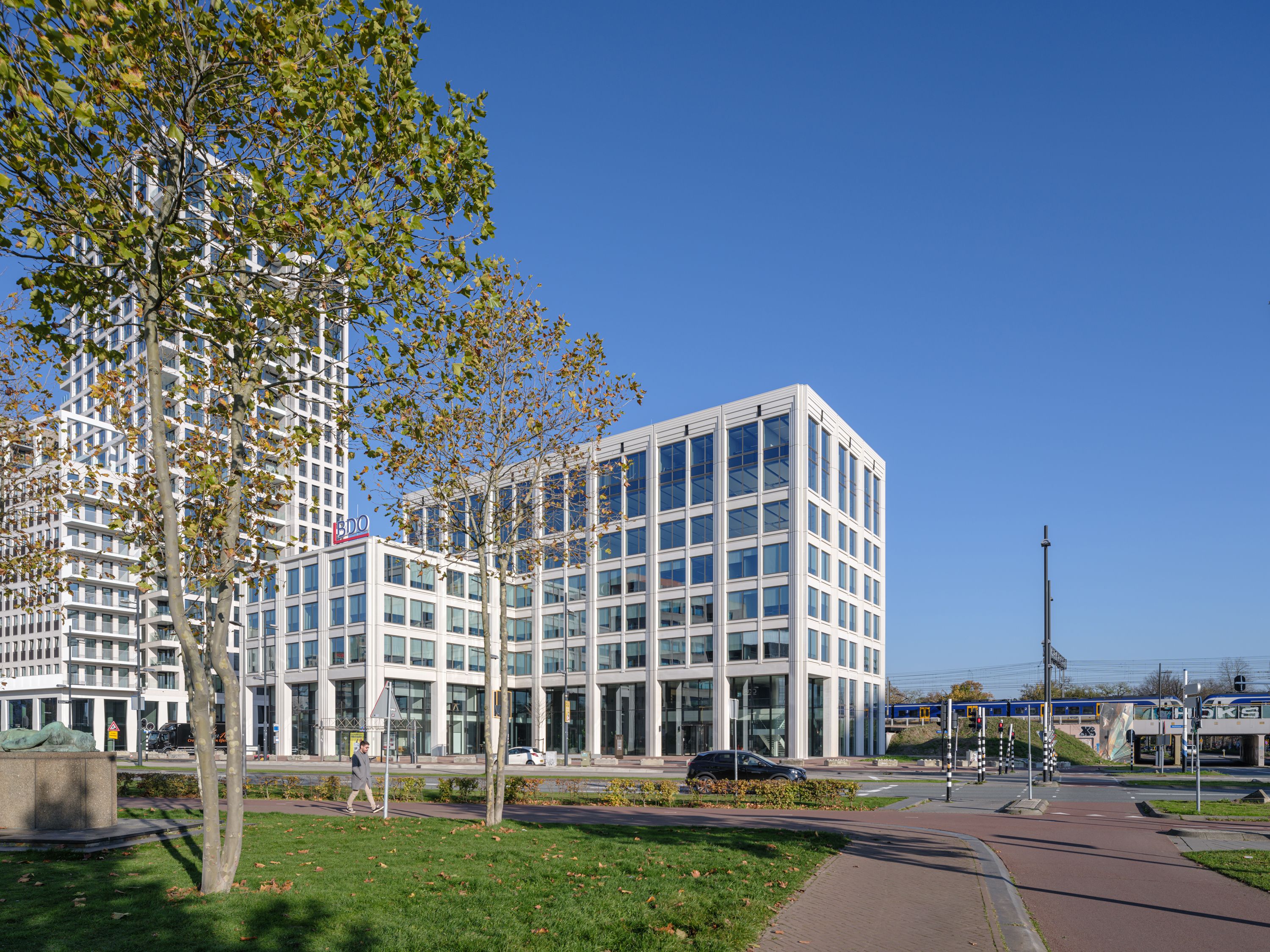 Wij zorgden ervoor dat de complexe interactie tussen de twee gebouwvolumes, de kenmerkende betonnen gevelstructuren, en de transparante plint met colonnade constructief en bouwkundig uitgewerkt werd. Daarbij stonden precisie, samenwerking met Kraaijvanger Architects en Jongen bouwpartners, en het waarborgen van de ontwerpintentie centraal.