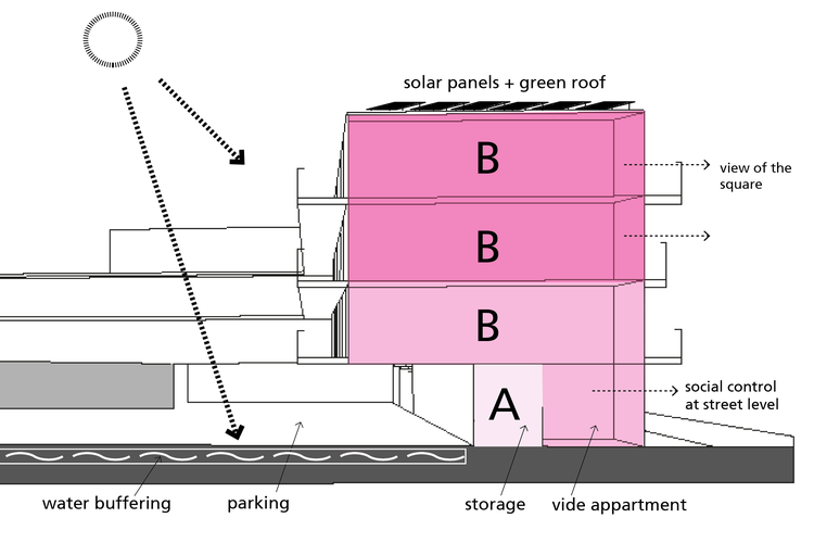 De circulaire thema’s (circulair materiaalgebruik, hoogwaardig hergebruik, comfort en water) komen in de architectuur tot uiting in circulaire wijze waarop baksteen in gevels is gebruikt, diversiteit en sociale interactie zichtbaar wordt en waterbuffering en groen een prominente plaats krijgen. Bim&Beyond maakte het plan uitvoeringsgereed voor de aannemer met een integraal bim model in samenwerking met constructeur en installateur.